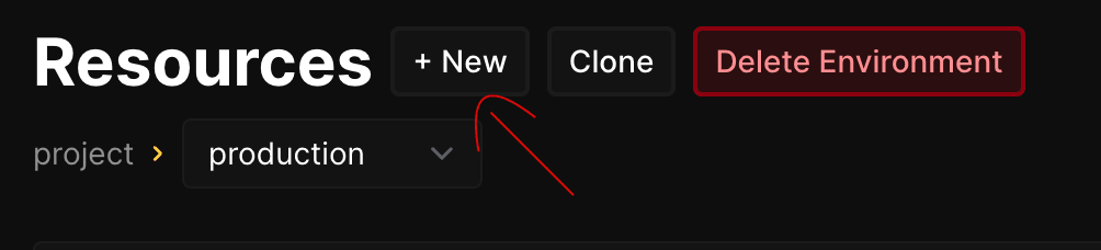 Yang perlu kita lakukan pertama kali adalah membuat Project di menu Projects. Setelah itu nanti didalam environment projects nya akan ada environment production secara otomatis. Klik environment tersebut dan kita akan berada dihalaman Resources. Disini langsung saja kita klik + New