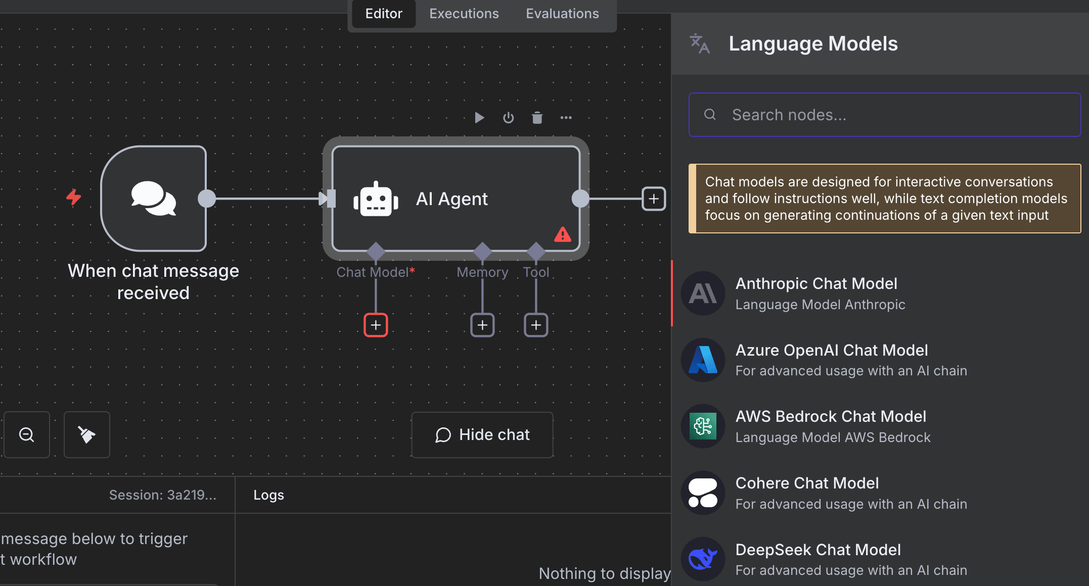 Di popup AI Agent juga tidak ada yang bisa kita lakukan untuk saat ini. klik keluar popup atau Back to canvas. kemudian dibawah node AI Agent, klik tombol + untuk Chat Model