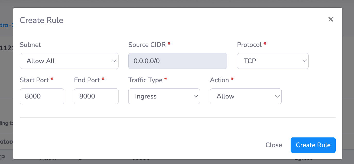 Sebelum kita login ke server, baiknya perlu untuk mengkonfigurasi port melalui VPC yang sudah dibuat (Untuk pembuatan VPC bisa dilakukan ketika proses pembuatan VM, atau bisa secara manual di menu Networking -> VPC). Kali ini kita perlu untuk memperbolehkan akses port 8000 di VM kita, karena Coolify akan berjalan diatas port ini. Jika kita tidak membuka port ini, maka nantinya Coolify tidak akan bisa diakses dari luar.