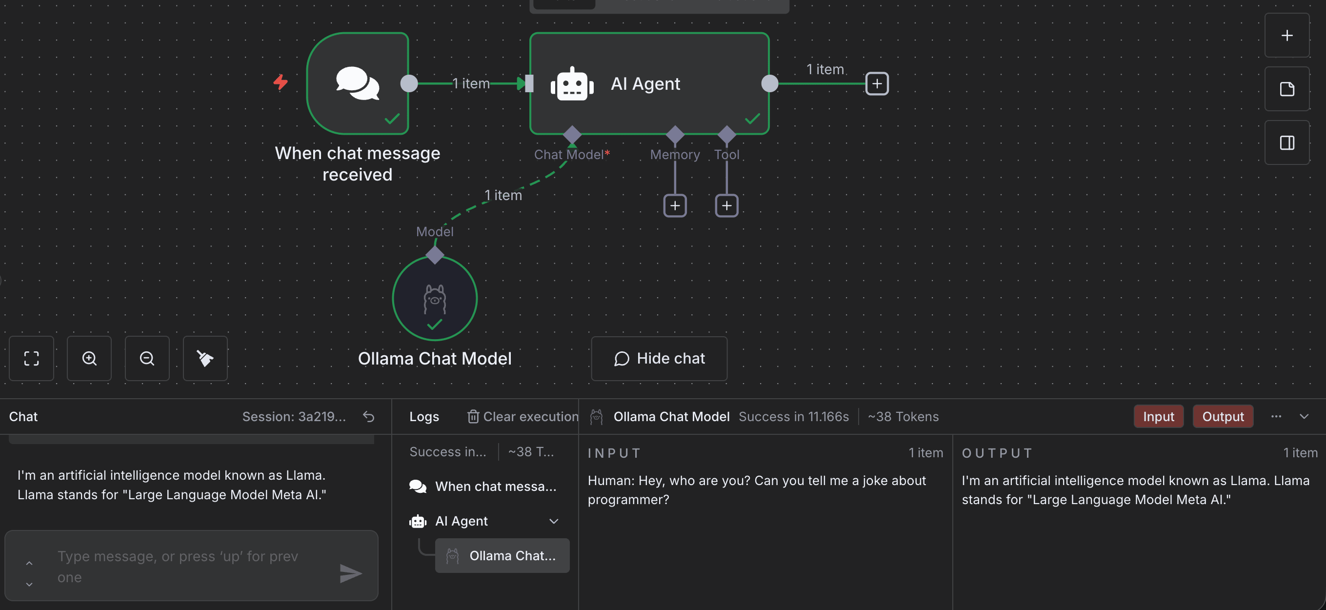 Sekarang kita bisa coba melakukan Chat di Chat Trigger didalam canvas tersebut. Dan hal ini bisa lakukan sebanyak apapun yang kita mau tanpa takut kehabisan token seperti ketika kita menggunakan platform AI seperti Anthropic atau Openai.