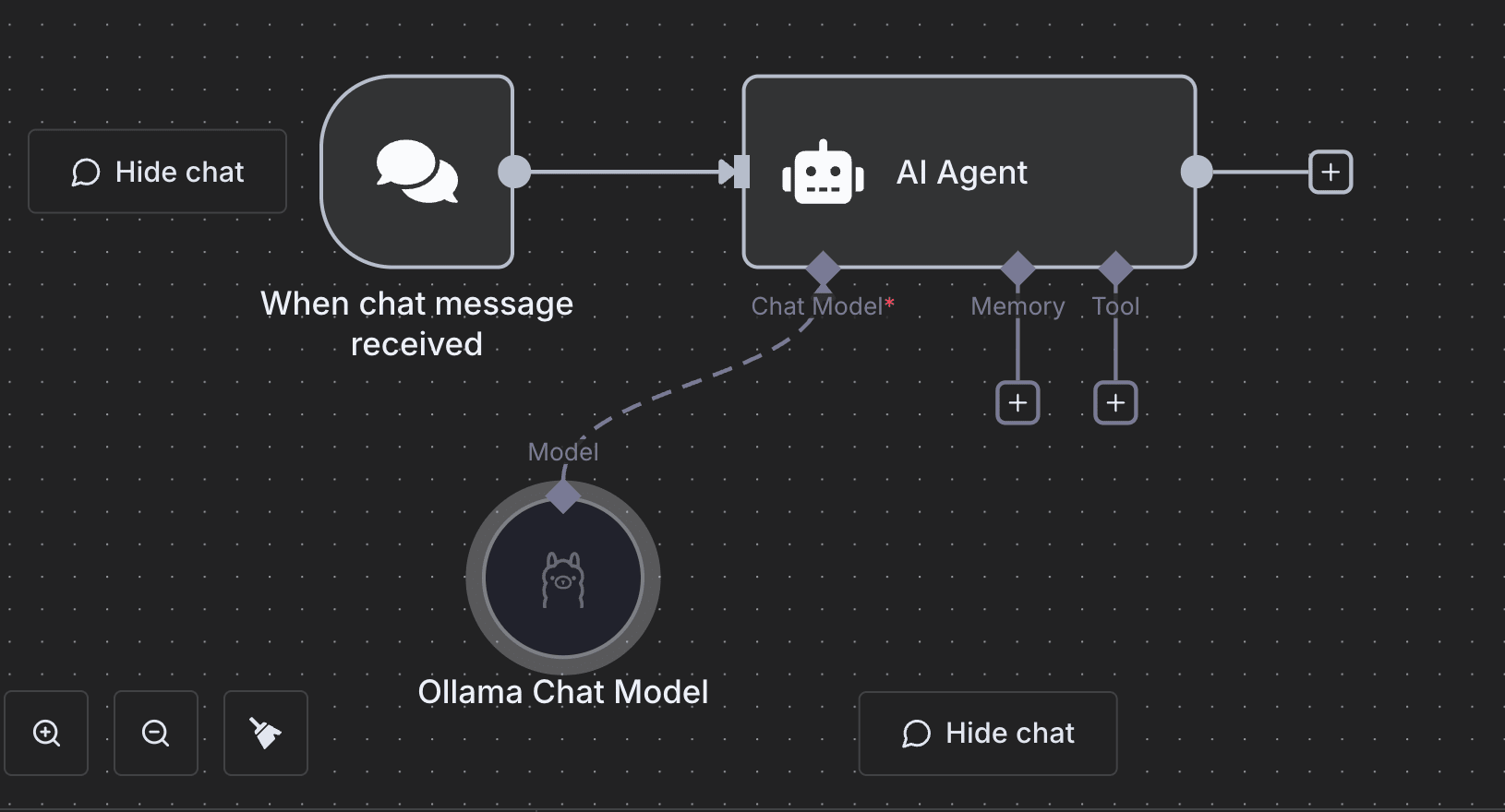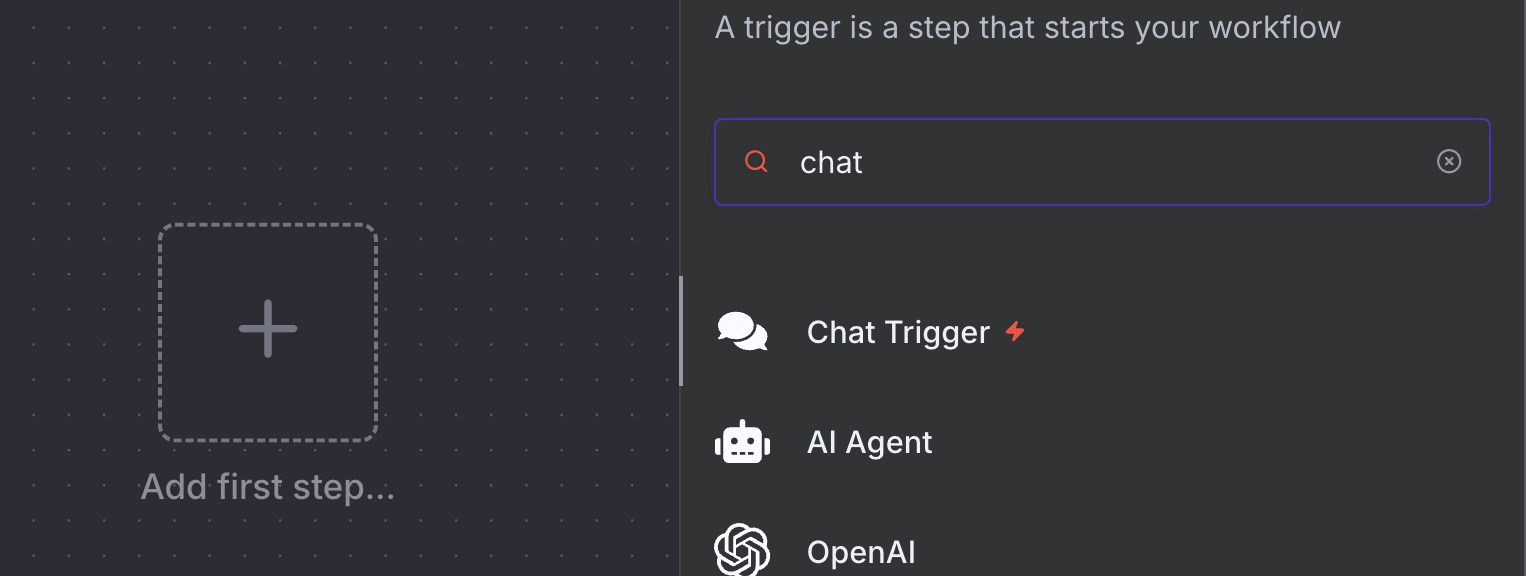 Kali ini kita akan coba untuk super simple workflow, yaitu membuat fitur chat di n8n yang terkoneksi dengan Ollama kita. Pertama klik icon + dan cari fitur Chat seperti dibawah ini