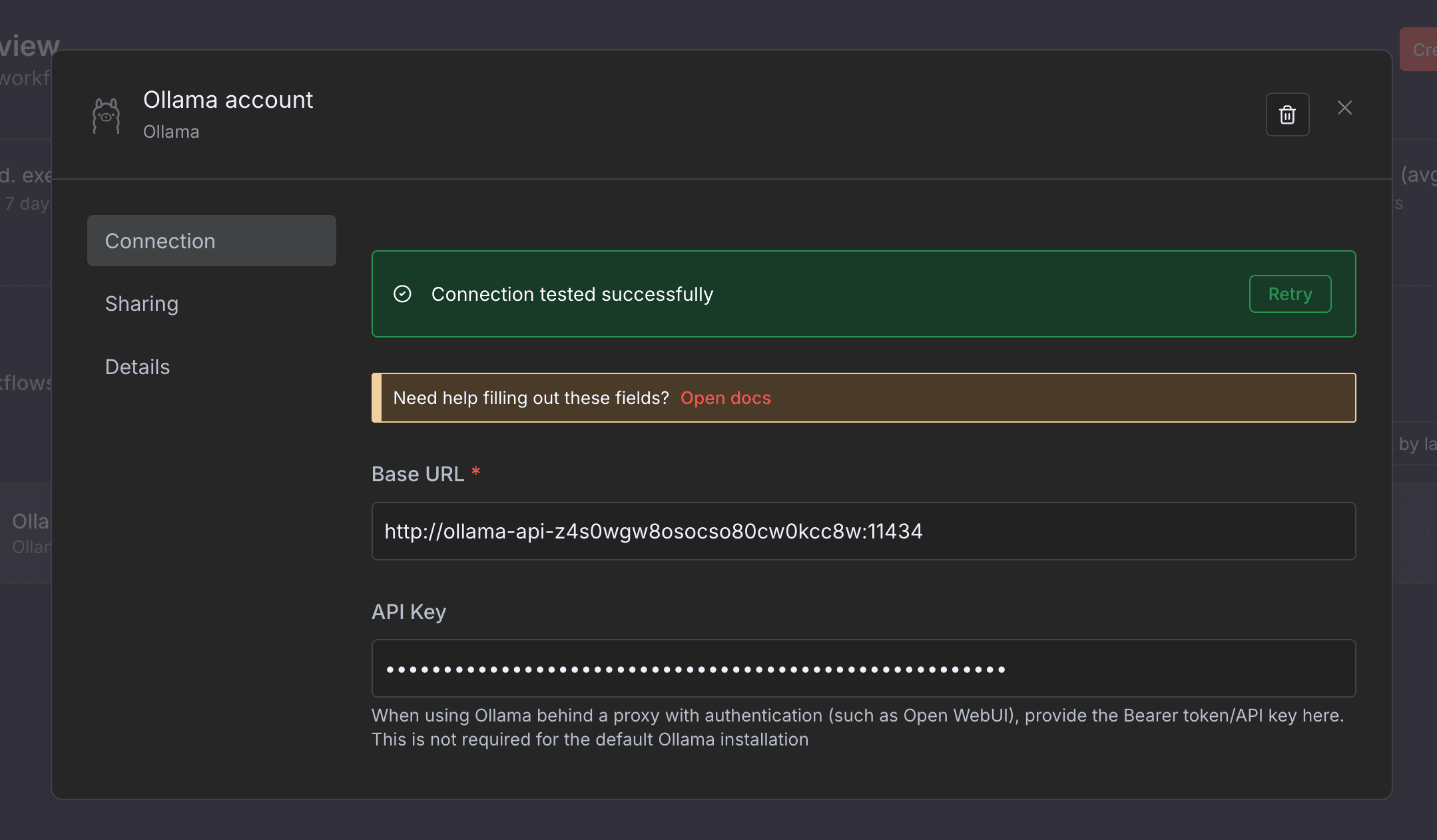 Jika url dan API Key nya sesuai dengan konfigurasi Ollama kita, ketika credential di-save akan muncul alert Connection tested successfully yang artinya kita bisa menggunakan Ollama kita sebagai jembatan untuk untuk mengoperasikan AI Agent. Kemudian nanti juga model yang ada di Ollama akan terdeteksi secara otomatis oleh N8N.