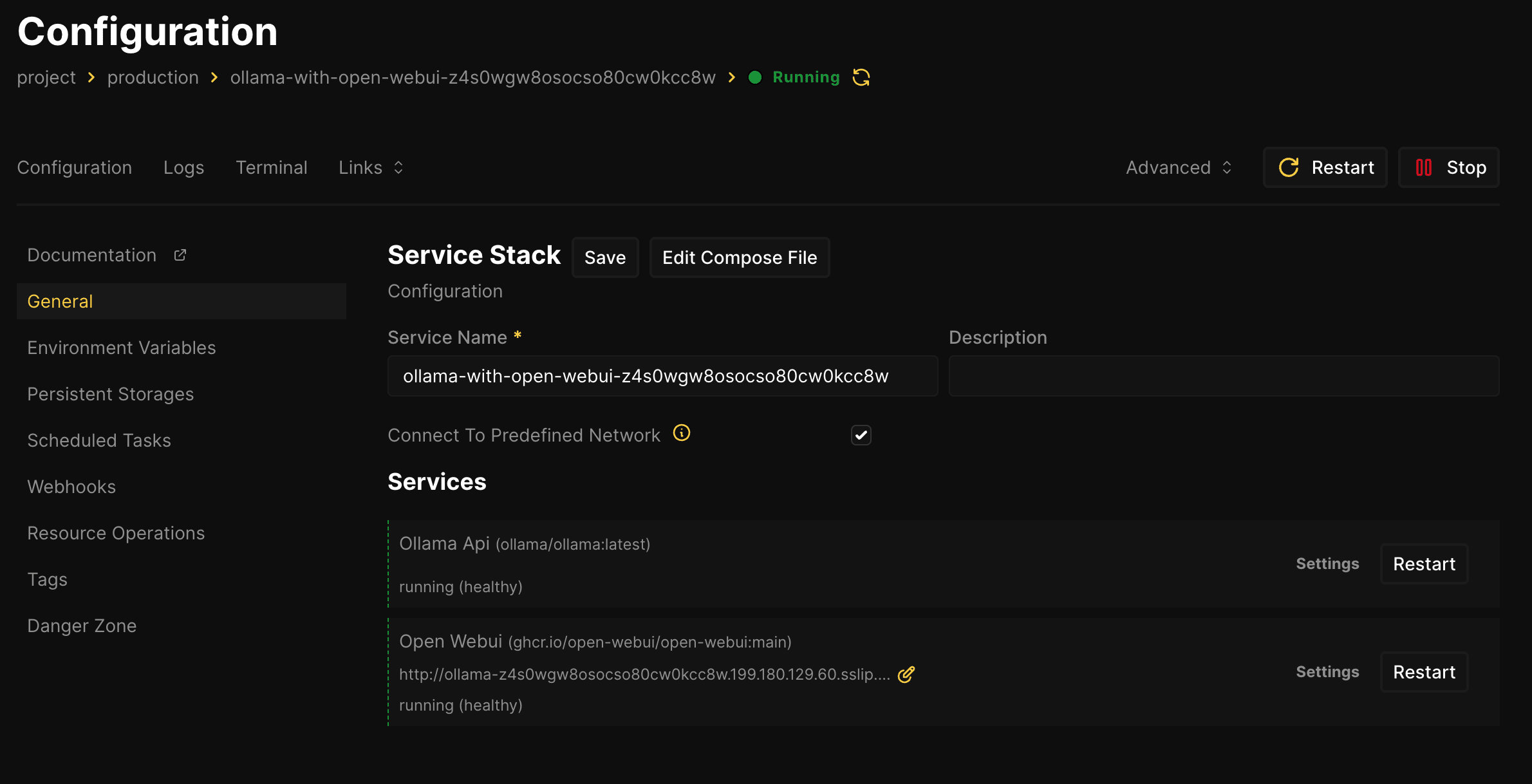 Setelah itu centang opsi ini Connect To Predefined Network, kemudian klik Deploy dan tunggu hingga prosesnya selesai. Jika selesai, nanti halaman service Ollama akan terlihat seperti ini