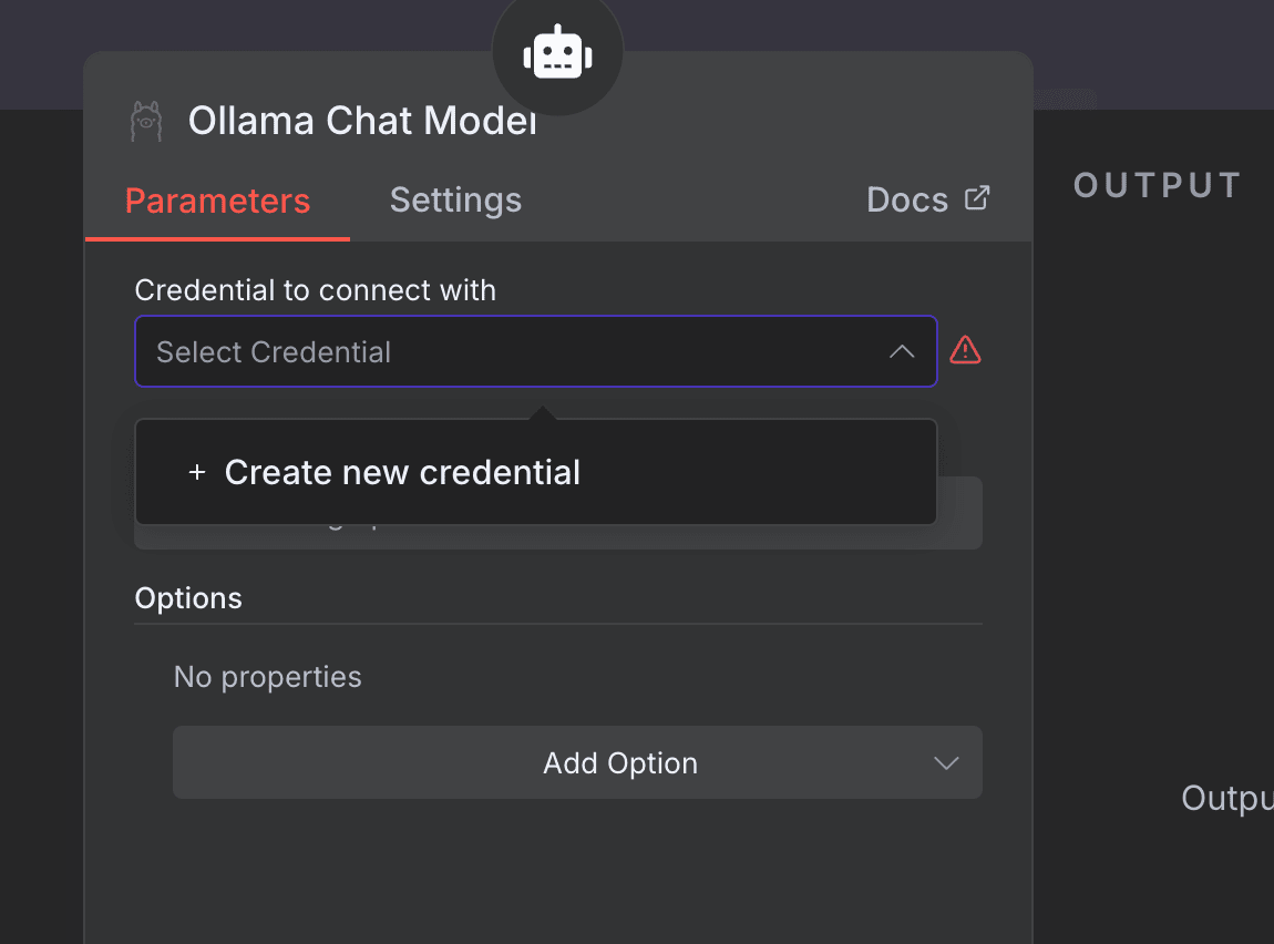 Kemudian pilih Ollama Chat Model. Setelah itu akan tampil popup dari Ollama Chat model. Pertama kita harus setup credential dari Ollama. Klik Create new credential