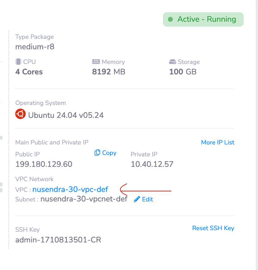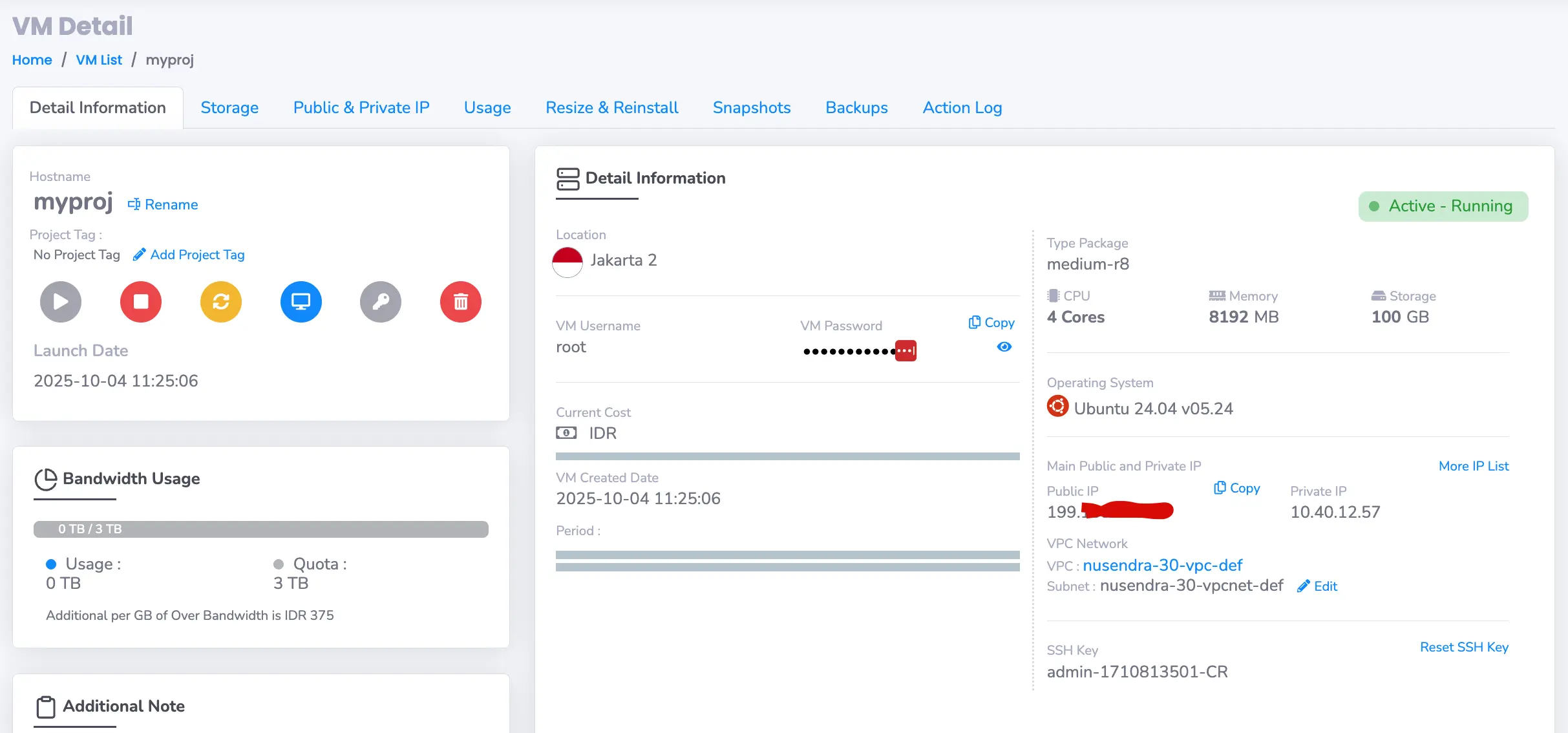 Setelah VM berhasil dibuat dengan spec minimum 8GB memory, yang perlu diperhatikan dihalaman VM Detail ini adalah username, password, dan Public IP. Untuk saat ini, akses SSH ke server akan kita lakukan dengan password, bukan dengan SSH Key. Namun kedepannya sangat disarankan untuk login via SSH Key agar lebih aman dan mudah.